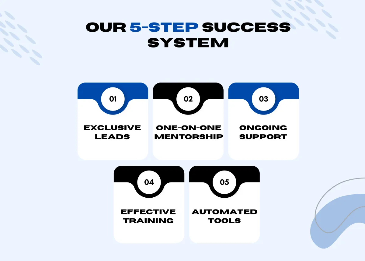 Our proven 5-step system is designed to help you succeed from day one and scale long term. You’ll have access to exclusive leads, one-on-one training, ongoing support and automated tools that simplify your workflow and keep you focused on producing and growing your business.