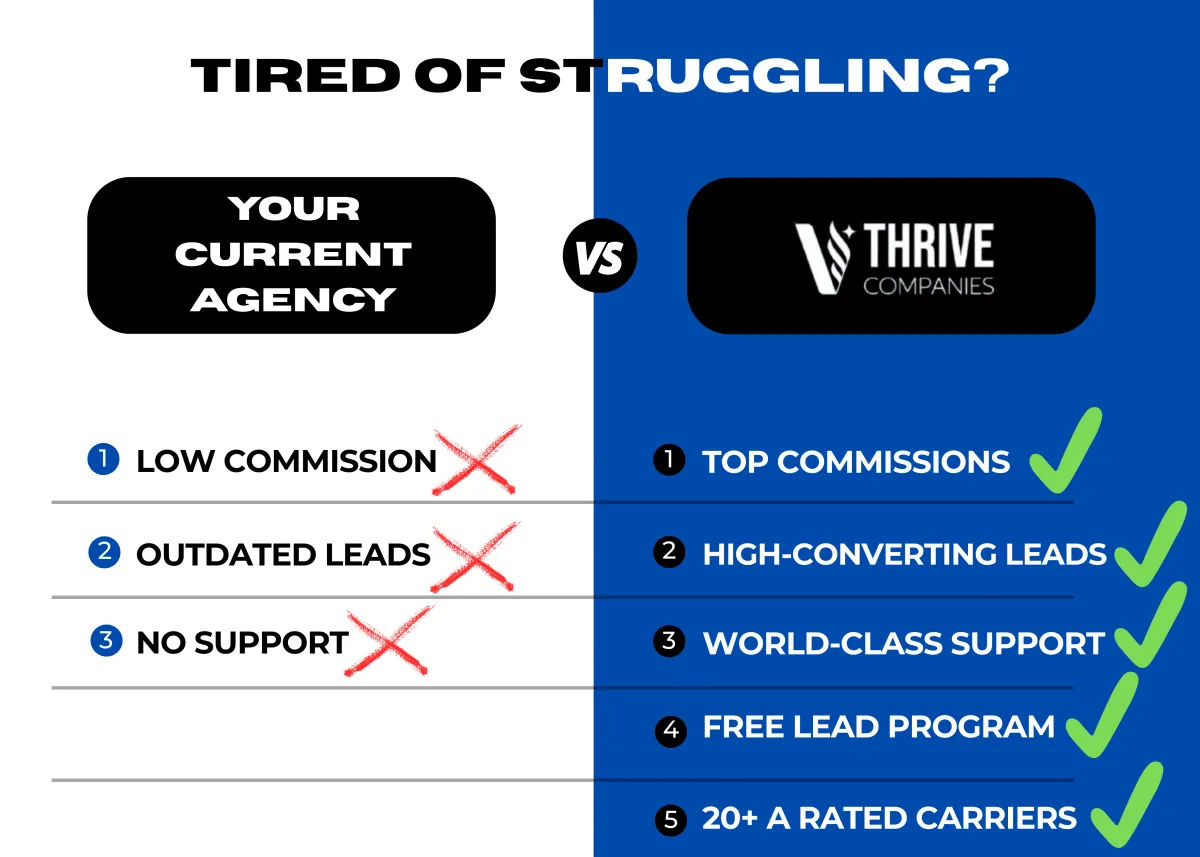 At Thrive, your income potential goes beyond individual sales. Our free lead program helps you start producing from day one—without a large upfront investment—so you can work real prospects, build skills, and generate commissions quickly.